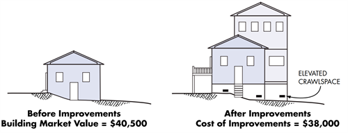Substantial improvement is any reconstruction, rehabilitation, addition or other improvement to a building, the total cost of which equals or exceeds 50 percent of the market value of the structure before the start of construction of the improvement. Most ordinances calculate improvements cumulatively; check your local ordinance for your specific requirements.